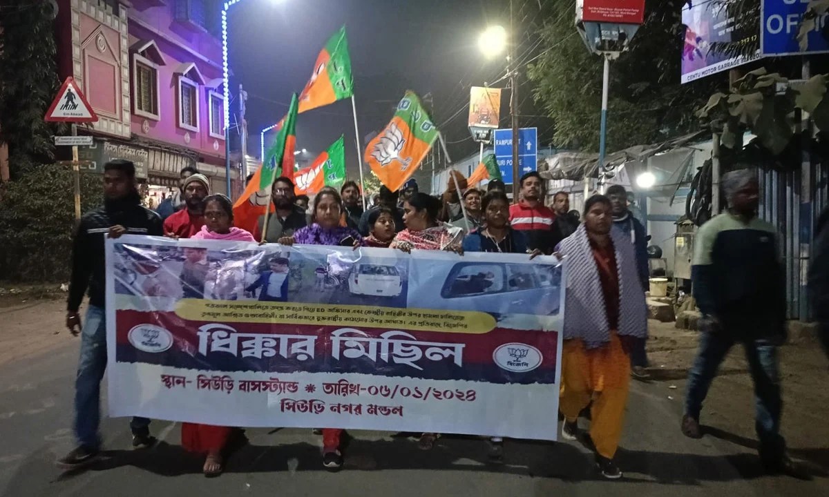 ইডি এবং কেন্দ্রীয় বাহিনীর উপর হামলার প্রতিবাদে বীরভূমের সিউড়িতে জেলা বিজেপির পক্ষ থেকে ধিক্কার মিছিল ও প্রতিবাদ সভা