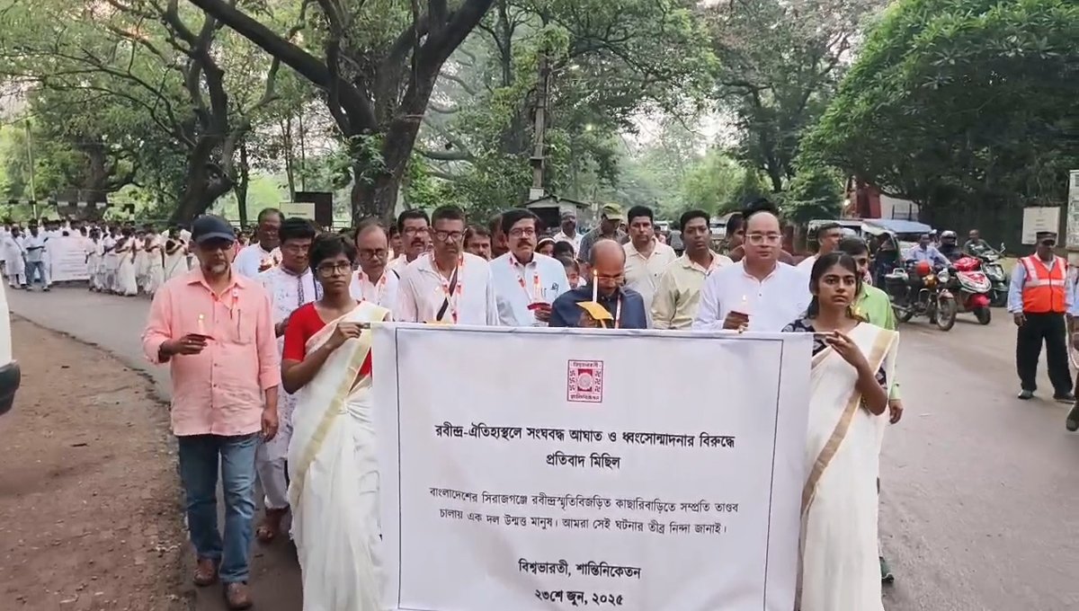বিশ্বভারতীর উপাচার্য প্রবীর কুমার ঘোষের তত্ত্বাবধানে মোমবাতি হাতে মৌন মিছিলে সামিল শিক্ষাকর্মী, অধ্যাপক-অধ্যাপিকাসহ পড়ুয়ারা৷ ২৩ জুন ঐতিহ্যবাহী উপাসনা গৃহ থেকে কেন্দ্রীয় গ্রন্থাগার পর্যন্ত এই মিছিল হয়৷ “বাংলাদেশে যেভাবে রবীন্দ্রনাথ ঠাকুরের কাছারিবাড়ি ভাঙচুর করেছে দুষ্কৃতিরা৷ তারই প্রতিবাদে আমরা পথে নেমেছি বলে উপাচার্য জানিয়েছেন৷ কবিগুরু রবীন্দ্রনাথের বাংলাদেশের সিরাজজগঞ্জে শাহজাদপুরে তাঁর স্মৃতিবিজড়িত পৈত্রিক বাড়িতে ভাঙচুর করেছে অজ্ঞাত পরিচয় দুষ্কৃতিরা৷ বেশকিছু মূল্যবান সামগ্রীও ক্ষতিগ্রস্ত হয়েছে। বাংলাদেশের সংবাদমাধ্যমেই তা প্রথম প্রকাশ পায়৷ এই ঘটনায় বিশ্বজুড়ে ওঠে নিন্দার ঝড়৷ নড়েচড়ে বসে বাংলাদেশ সরকার। এপার বাংলা পশ্চিমবঙ্গেও তার আঁচ পরে৷ রাজ্যের মুখ্যমন্ত্রী মমতা বন্দ্যোপাধ্যায় বিষয়টি গুরুত্ব দিয়ে দেখার জন্য দেশের প্রধানমন্ত্রীকে চিঠি দিয়েছেন। বিরোধী দলগুলিও প্রতিবাদে সরব৷ এদিন বিশ্বভারতীর ঐতিহ্যবাহী উপাসনা গৃহের সামনে জমায়েত হয়ে রবীন্দ্রসঙ্গীত গাওয়া হয়৷ পরে মোমবাতি হাতে মৌন মিছিলে পা মেলান উপাচার্য প্রবীর কুমার ঘোষ, ভারপ্রাপ্ত জনসংযোগ আধিকারিক অতিগ ঘোষ, বিশ্বভারতীর অধ্যাপক-অধ্যাপিকা,পড়ুয়া সহ আশ্রমিকেরা৷ কেন্দ্রীয় কার্যালয় পর্যন্ত এই মিছিল পরিক্রমা করে ৷
