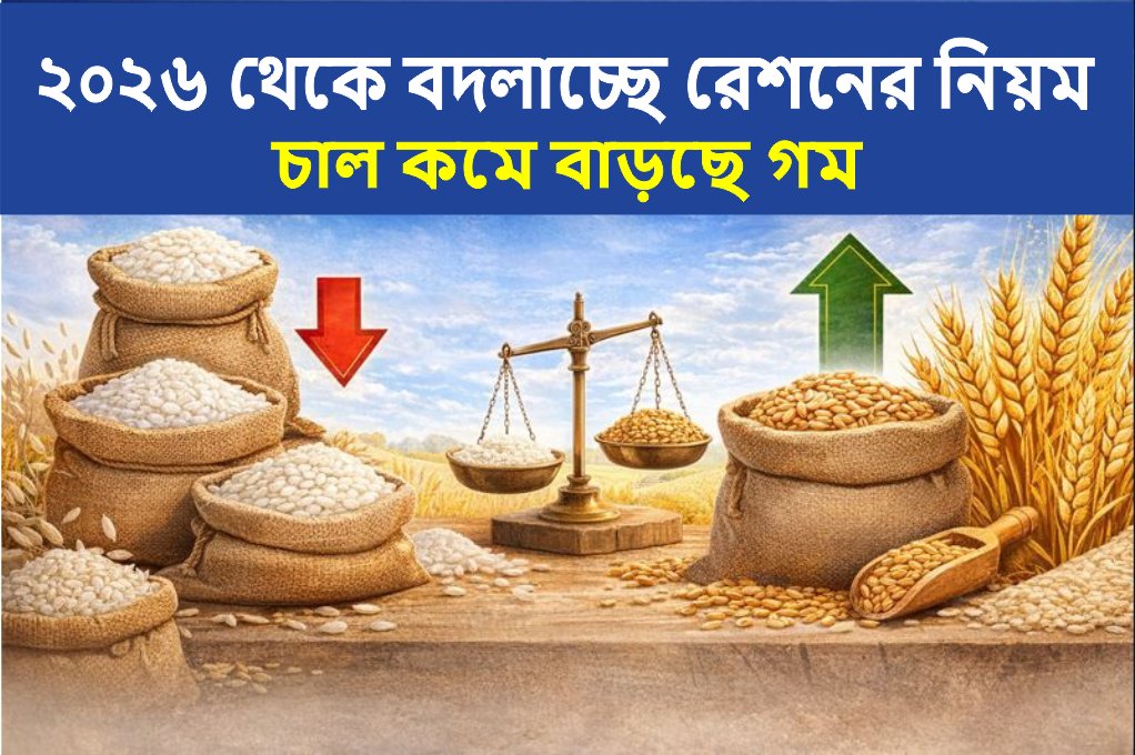পশ্চিমবঙ্গের লক্ষ লক্ষ মানুষের জীবনের সঙ্গে ওতপ্রোতভাবে জড়িয়ে থাকা রেশন ব্যবস্থায় আসতে চলেছে বড় পরিবর্তন। ২০২৬ সালের জানুয়ারি মাস থেকে কেন্দ্রীয় সরকারের আওতাধীন রেশন কার্ডগুলিতে চাল ও গমের বরাদ্দে উল্লেখযোগ্য রদবদল কার্যকর হবে। খাদ্য দফতর সূত্রে জানা গিয়েছে, নতুন এই ব্যবস্থায় চালের পরিমাণ কিছুটা কমিয়ে গমের উপর বেশি গুরুত্ব দেওয়া হচ্ছে।