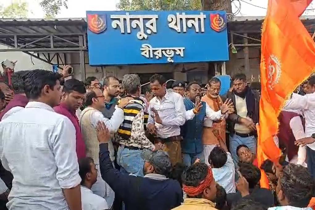 এদিন সংঘের সদস্যরা সংঘের পতাকা নিয়ে ‘জয় শ্রীরাম’ স্লোগান দিয়ে থানা ঘেরাও করে বিক্ষোভ দেখায়। নেতৃত্ব দেন সংঘের সদস্যদের সঙ্গে বীরভূম জেলার বিজেপি নেতারাও৷ উপস্থিত ছিলেন বীরভূম সাংগঠনিক জেলা সভাপতি উদয়শঙ্কর বন্দ্যোপাধ্যায় ও বোলপুর সাংগঠনিক জেলা সভাপতি শ্যামাপদ মণ্ডল প্রমুখ।