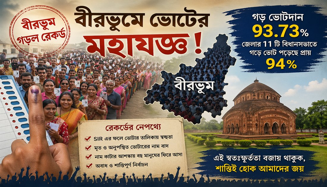 এবারের বিধানসভা নির্বাচনে বীরভূম জেলা দেখল এক অভূতপূর্ব দৃশ্য। শতাংশের হিসেবে ৯৩.৭৩ শতাংশ ভোট দিয়ে বীরভূম গড়েছে সর্বকালীন রেকর্ড। অবাধ ও শান্তিপূর্ণ নির্বাচনের আবহে এই বিপুল জনজোয়ার রাজনৈতিক মহলে রীতিমতো বিস্ময় তৈরি করেছে। জেলার ১১ টি বিধানসভাতে গড়ে ভোট পড়েছে প্রায় ৯৪ শতাংশ।
