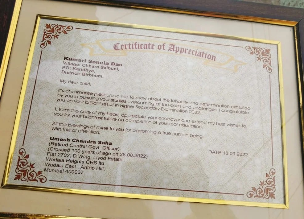 All India Panjab National Bank Offices Association-এর উদ্যোগে কড়িধ্যা বিদ্যানিকেতন উচ্চ বিদ্যালয়ের দুঃস্থ ও মেধাবী ছাত্রী সোনিয়া দাস সংবর্ধিত হল কলকাতায়। পাঞ্জাব ন্যাশন্যাল ব্যাঙ্কের জেনারেল সেক্রেটারী (All India Panjab National Bank Offices Association) মি. দিলীপ দাস দ্বাদশ উত্তীর্ণ ছাত্রী সোনিয়ার হাতে মাসিক এক হাজার টাকার আর্থিক অনুদান তুলে দেন তার পড়াশোনার ধারাবাহিকতা বজায় রাখার জন্য। এর আগে ৭ আগস্ট ২০২২ সালে বর্ধমান সংস্কৃতি লোকমঞ্চে ব্যাঙ্কের 25th Felicitation Ceremony for Brilliant Students Annual General Body Meeting-এ সোনিয়াকে সংবর্ধিত করা হয় এবং এককালীন ৭০০০টাকা তার হাতে তুলে দেওয়া হয়। সেইসঙ্গে তার হাতে তুলে দেওয়া হয় পড়াশোনার নানা সামগ্রী। মেধাবী, পড়াশোনায় আগ্রহী ছাত্রী সোনিয়ার পড়াশোনাকে এগিয়ে নিয়ে যাওয়ার জন্য বিভিন্ন স্বেচ্ছাসেবী সংস্থাও এগিয়ে এসেছে। ‘বীরভূম লালমাটির দেশ’ এবং ‘নতুন সকাল’ আর্থিক সহযোগিতার হাত বাড়িয়ে দিয়েছে। নতুন সকাল ১৮ সেপ্টেম্বর এককালীন ৩০০০টাকা এবং একটি গাছের চারা সোনিয়া দাসের হাতে দেন। সমস্ত কর্মকাণ্ডের জন্য পাঞ্জাব ন্যাশন্যাল ব্যাঙ্কের সিউড়ি শাখার ডেপুটি ম্যানেজার তুহিন কুমার দাসকে সোনিয়ার পরিবার ও বিদ্যালয়ের পক্ষ থেকে ধন্যবাদ ও কৃতজ্ঞতা জানানো হয়।