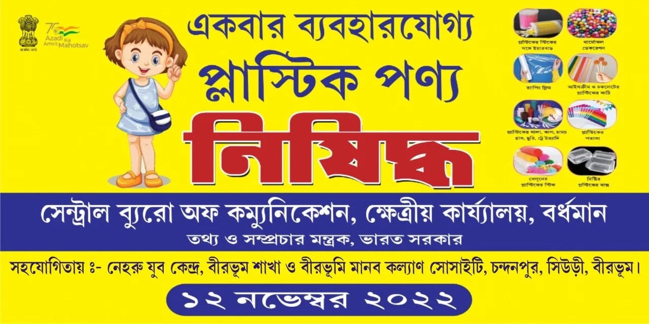 পরিবেশ দূষণের অন্যতম কারণ প্লাস্টিক বর্জ্য। একবার ব্যবহারযোগ্য এমন প্লাস্টিকের ব্যবহার নিষিদ্ধ করেছে ভারত সরকার। এই বিষয়টি জনমানসে প্রচারের লক্ষ্যে ভারত সরকারের তথ্য সম্প্রচার মন্ত্রকের সেন্ট্রাল ব্যুরো অফ কমিউনিকেশন ক্ষেত্রীয় কার্যালয়, বর্ধমান এর উদ্যোগে আজ ১২ নভেম্বর বীরভূমের সিউড়ি ১ নম্বর ব্লকের “মল্লিকপুর” গ্রাম পঞ্চায়েতের ‘চন্দনপুর’ গ্রামে একটি সচেতনতামূলক অনুষ্ঠান অনুষ্ঠিত হয়। বীরভূম জেলার নেহেরু যুব কেন্দ্র এবং বীরভূমি মানবকল্যাণ সোসাইটির সহায়তায় এই অনুষ্ঠানে প্রশ্নোত্তর প্রতিযোগিতা, সচেতনতামূলক বাউল গান এমন নানান অনুষ্ঠান পরিবেশিত হয়। অংশগ্রহণ করেন গ্রামের সাধারণ মানুষজন। বীরভূম মহাবিদ্যালয়ের অধ্যক্ষ ড. পার্থসারথি মুখোপাধ্যায়ের হাত ছুঁয়ে প্রদীপ প্রজ্জ্বলনের মধ্য দিয়ে অনুষ্ঠানের শুভ সূচনা হয়। উপস্থিত ছিলেন সংস্থার ডিজি ভূপেন্দ্র কাইনথিলা, নাবার্ড এর বীরভূম জেলা বিকাশ প্রবন্ধক অনুপম পট্টনায়ক, স্বেচ্ছাসেবী সংস্থার সম্পাদক শিক্ষক সচ্চিদানন্দ মুখার্জি প্রমুখ।