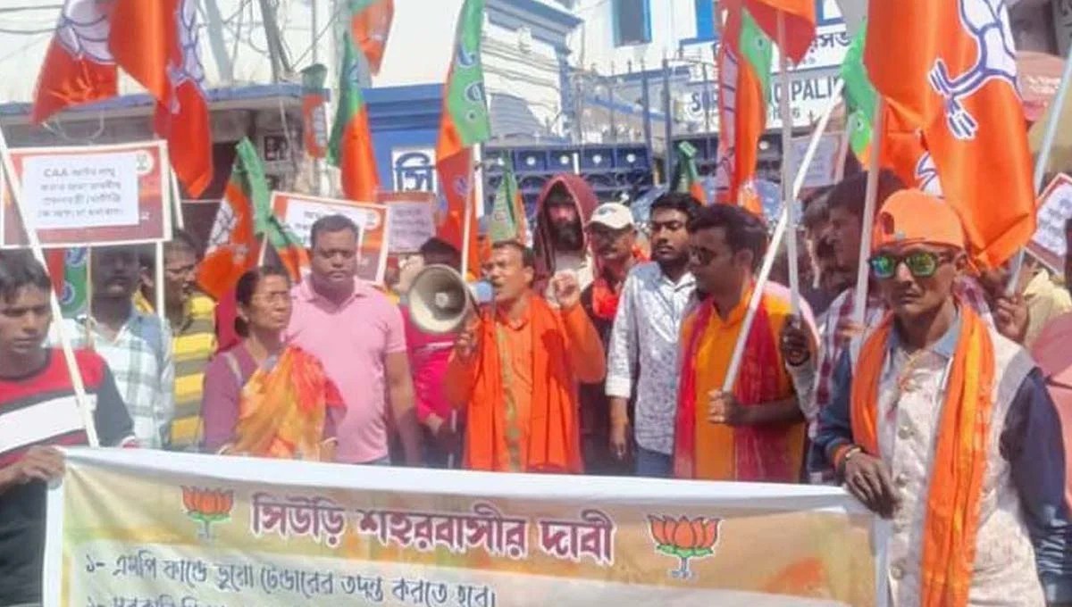ইডি এবং কেন্দ্রীয় বাহিনীর উপর হামলার প্রতিবাদে বীরভূমের সিউড়িতে জেলা বিজেপির পক্ষ থেকে ধিক্কার মিছিল ও প্রতিবাদ সভা